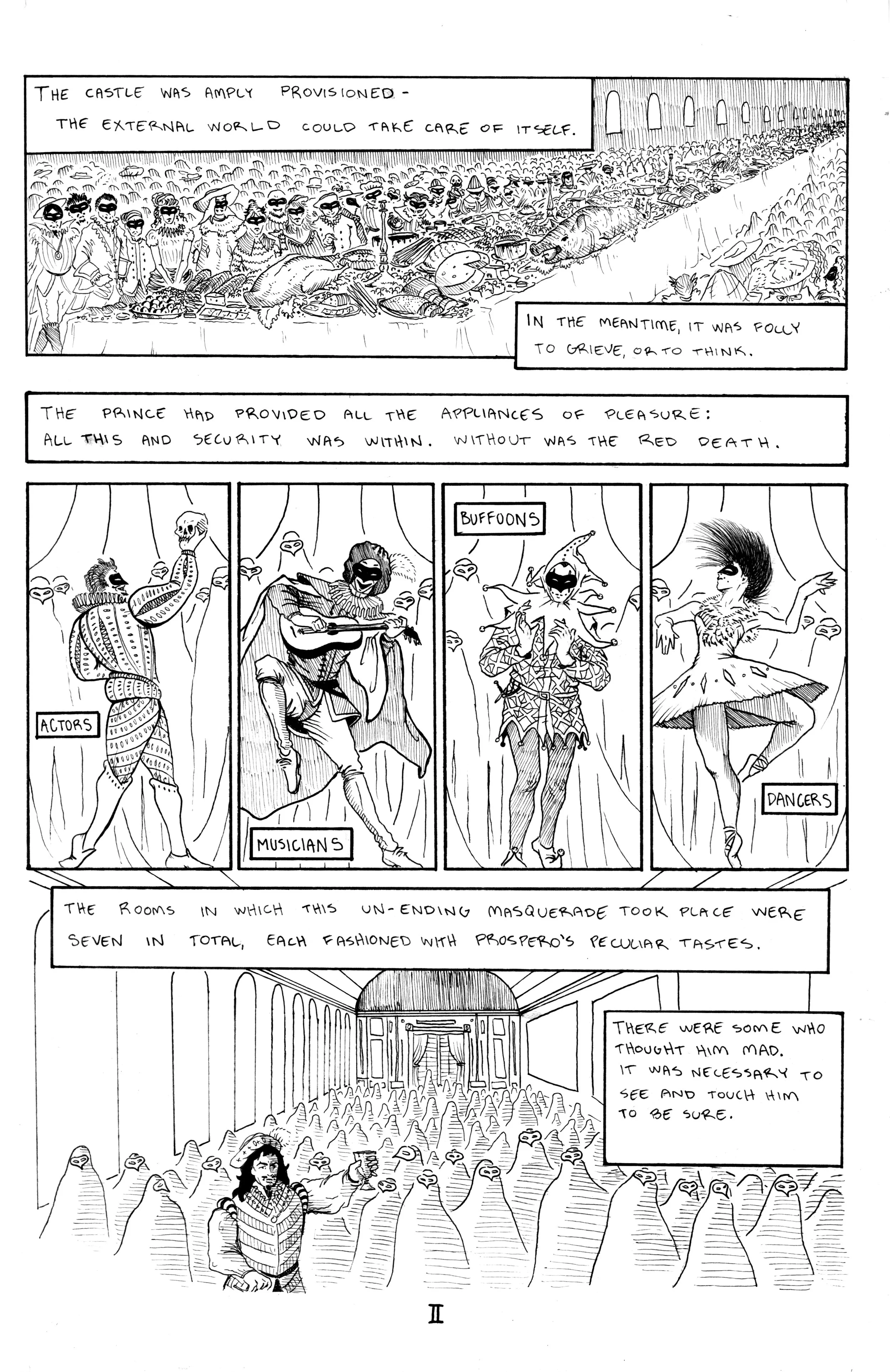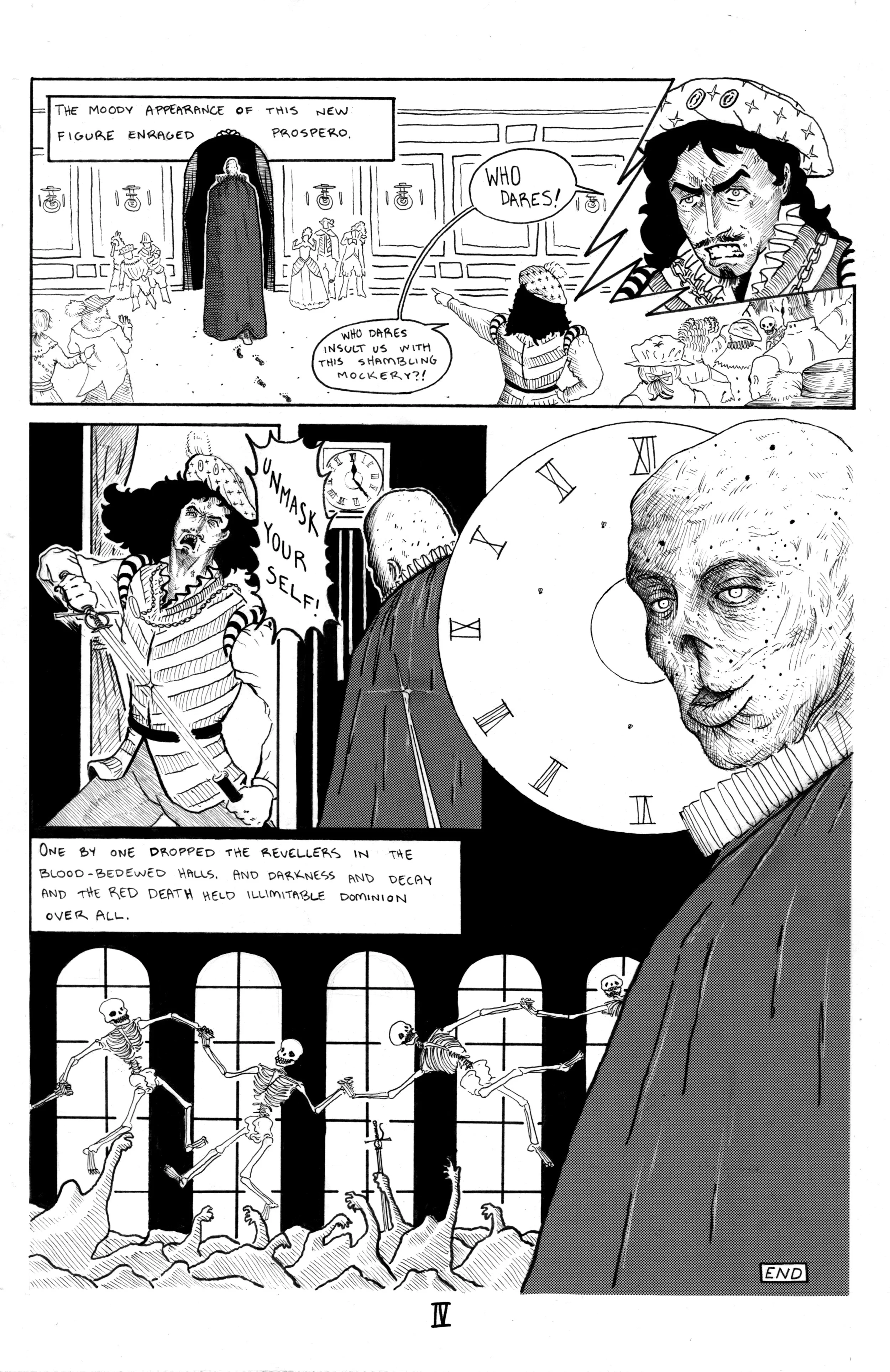 THE MASQUE OF THE RED DEATHAdapted from Poe’s text, Masque proves to be a relevant plague-time tale. Pen, Screentone - 2022Click images to enlarge. View fullsize View fullsize View fullsize View fullsize